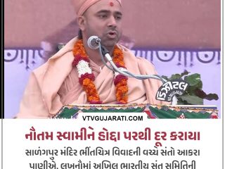 અમદાવાદમાં મળેલા સંત સંમેલનમાં સાધુ-સંતોએ સ્વામિનારાયણ સંપ્રદાયનો કર્યો બહિષ્કાર… તો બીજી તરફ વિવાદ બાદ નૌતમ સ્વામીને અખિલ ભારતીય સંત સમિતિના અધ્યક્ષ પદેથી હટાવી દેવાયા છે. સાળંગપુર મંદિરમાં હનુમાનજીના ચિત્રો પર વિવાદ બાદ નૌતમ સ્વામી અંગે સૌથી મોટા સમાચાર સામે આવ્યા છે. વિવાદ બાદ નૌતમ સ્વામીને અખિલ ભારતીય સંત સમિતિના અધ્યક્ષ પદેથી હટાવાયા છે. તેમને ગુજરાત…